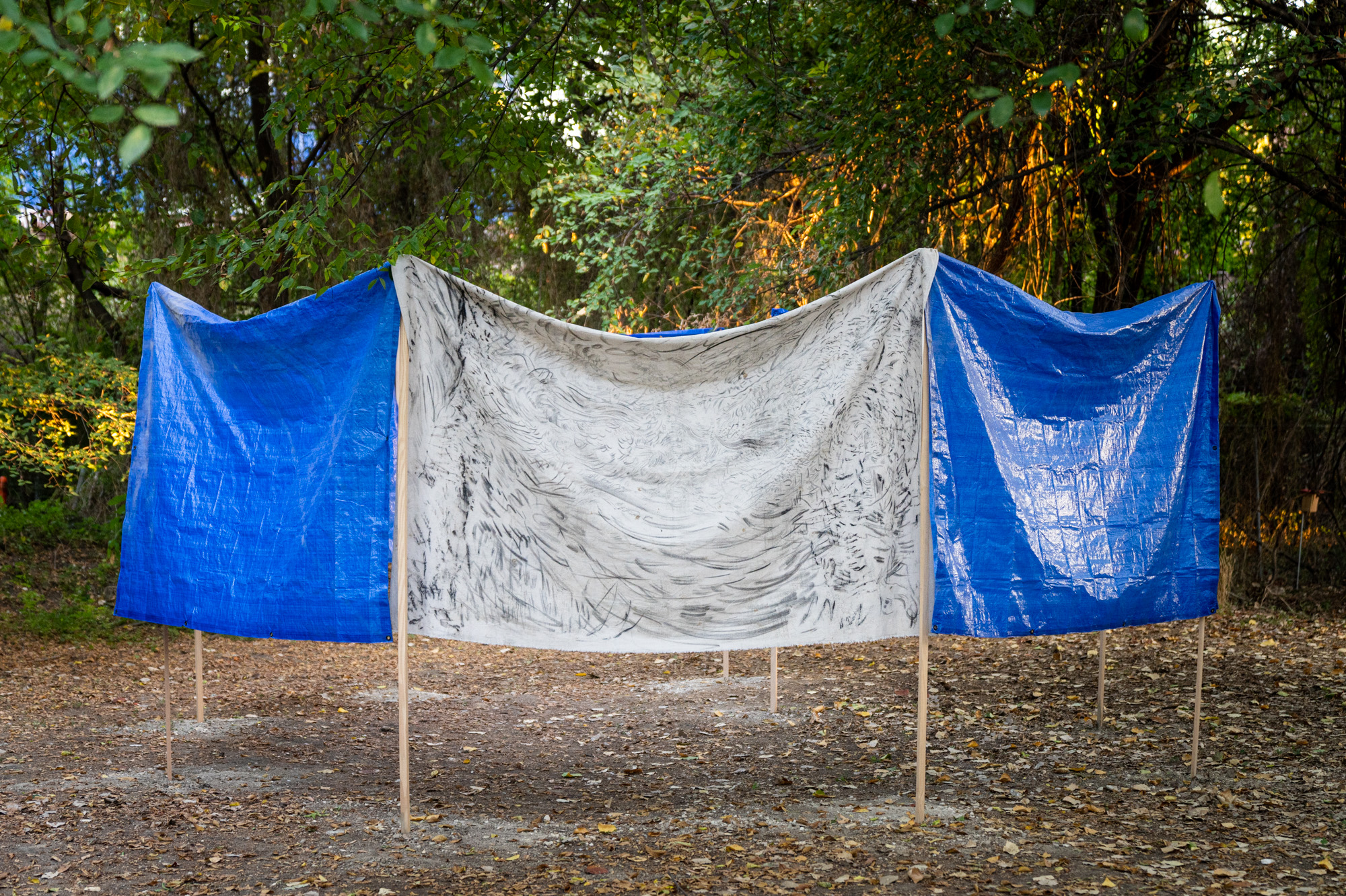 Ricardo Morales-Hernández Forced Autumn I -SDG-017-004, 2017/2021 Artist-made charcoal on canvas drop cloth, tarps, wood Structure: 22’ in diameter Painting: 67” x 108” |